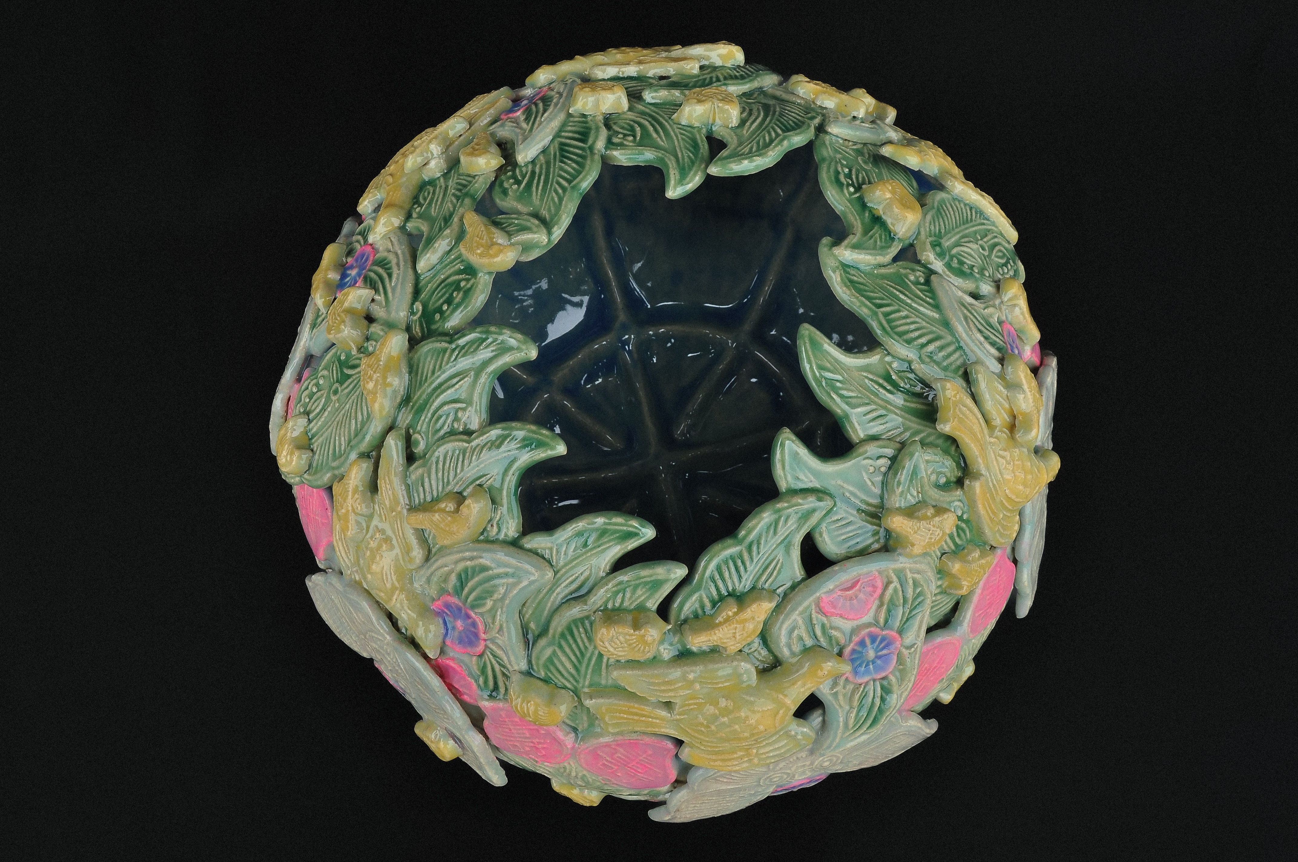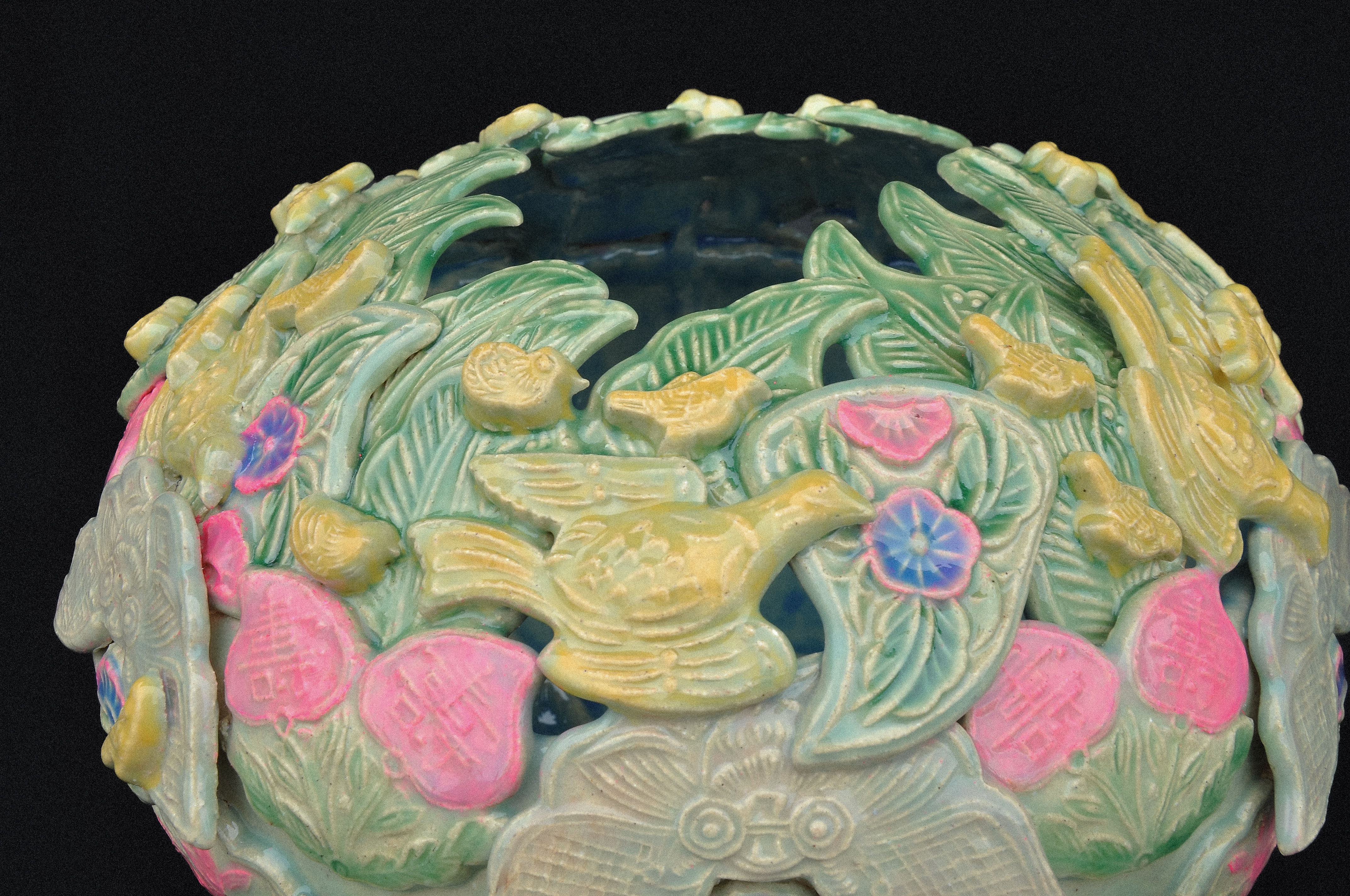 "The fluorescent lacquer ceramic sculpture named "The Sun, the Moon, and the Sparrows 太阳、月亮与雀" was made by 27-year-old local ceramic artist (Shayne Phua). The work reflects the diverse culture of our country and builds a warm community."